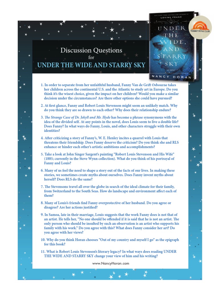 At the age of 35 Fanny Van de Grift Osbourne has left her philandering husband in San Francisco to set sail for Belgium --- with her three children and nanny in tow --- to study art. In the latest gathering of TODAYs Book Club Nancy Horan author of Under the Wide and Starry Sky joined Natalie Morales and TODAY viewers in a. Our Reading Guide for Under the Wide and Starry Sky by Nancy Horan includes Book Club Discussion Questions Book Reviews Plot Summary-Synopsis and Author Bio.