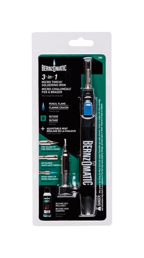 The three-in-one pencil flame micro torch and soldering iron features three interchangeable settings. Use only Bernzomatic Butane fuel when refilling torch. It is a useful little device that has a wide range of applications.