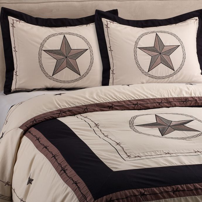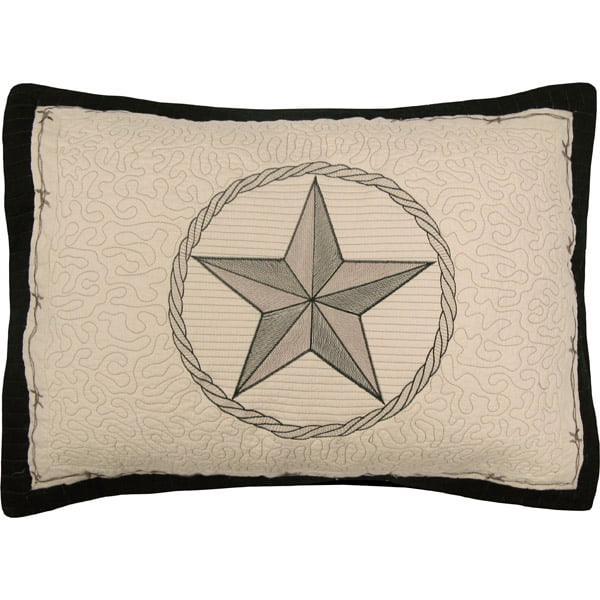 TWIN QUEEN KING STD SHAM KING SHAM. This beautiful quilt is designed in tan brown and black colors with embroidered barbed wire and a Texas Star centerpiece. Tie closure on reverse side for convenience Prewashed to prevent shrinking and increase softness The Texas Pride Quilt.
